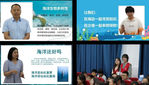 甄文全博士以“保护海洋生物多样性”为主题,以海龟、海马、海牛、海豹、海狮、海象、海鬣蜥、海兔、狮子鱼、小丑鱼、蝴蝶鱼、鲀鱼、鲳、鲻、牙鲆、鲷、扇贝、牡蛎、文蛤、青蛤、毛蚶等向学生们介绍了海洋动物多样性;以金字塔形式导入海洋生物能量传递过程,介绍海洋生物生生不息的内在规律以及全过程生态保护的潜在理念。纪崇霄博士以“认知海洋 呵护蔚蓝”为主题,带领同学认识海洋、海洋重要性、海洋环境现状,传递海洋环境保护理念,启发同学从自己做起、从身边小事做起,多做保护环境和保护海洋的事。大学生志愿者以“海草与海鸟”为题,向同学们介绍了海草的分布、生态作用,以及著名候鸟——东方白鹳在唐山的生存情况,唤起同学们的好奇心和想象力;又以“海洋挖呀挖”歌曲带动同学们体验海洋与海洋生物的魅力。