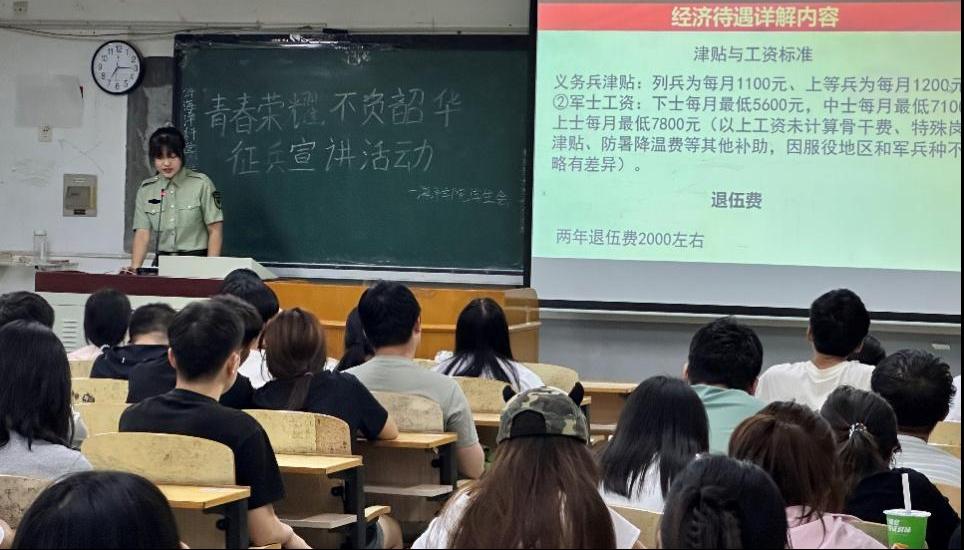 活动伊始,yl23455永利集团党总支副书记刘凯首先强调,国防事业是国家安全稳定的坚实支柱,青年学子投身军营,不仅是个人成长的宝贵机遇,更是履行公民义务的重要体现。她鼓励在场学子树立远大志向,将个人理想融入国家发展大局,积极响应国家号召,踊跃报名参军。随后,2022级物流管理专业优秀退伍学生陈紫婷同学进行征兵宣讲,内容围绕三个方面展开:“为什么要参军”方面,她结合自身从学生到军人的蜕变过程,阐述了军队对个人意志品质和身体素质的提升作用;“针对入伍职业规划和优惠政策”,她详细解读了唐山市在学费补偿、升学、就业安置等方面的利好政策,并通过战友在部队考取军校的实例,展现军队广阔的发展前景;“关于入伍流程”方面,她以自身经历为范本,对报名、体检、政审等环节进行清晰讲解,让同学们对参军步骤一目了然。此外,陈紫婷还分享了对部队生活的感悟,讲述了与战友们在训练和生活中结下的深厚友谊,激发了同学们对军营生活的无限向往。