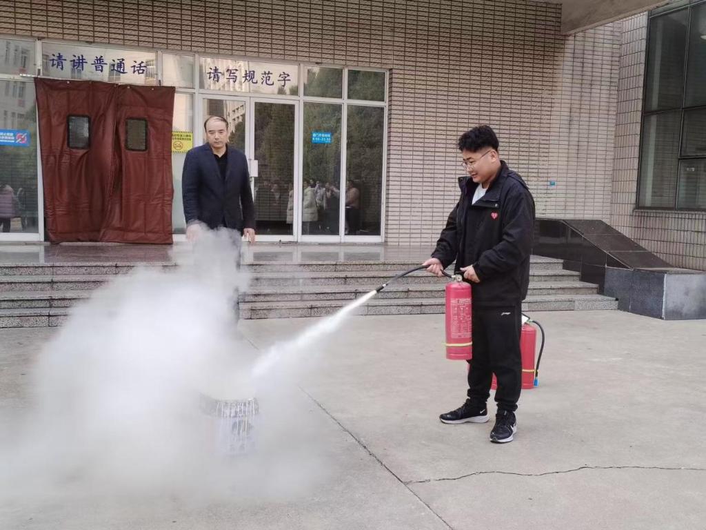 第三个环节,金佳勇书记为同学们讲解了灭火器、消防栓的使用方法,金书记强调牢记灭火器使用方法“一拔、二拉、三瞄、四压”,并组织部分学生进行了实际操作。